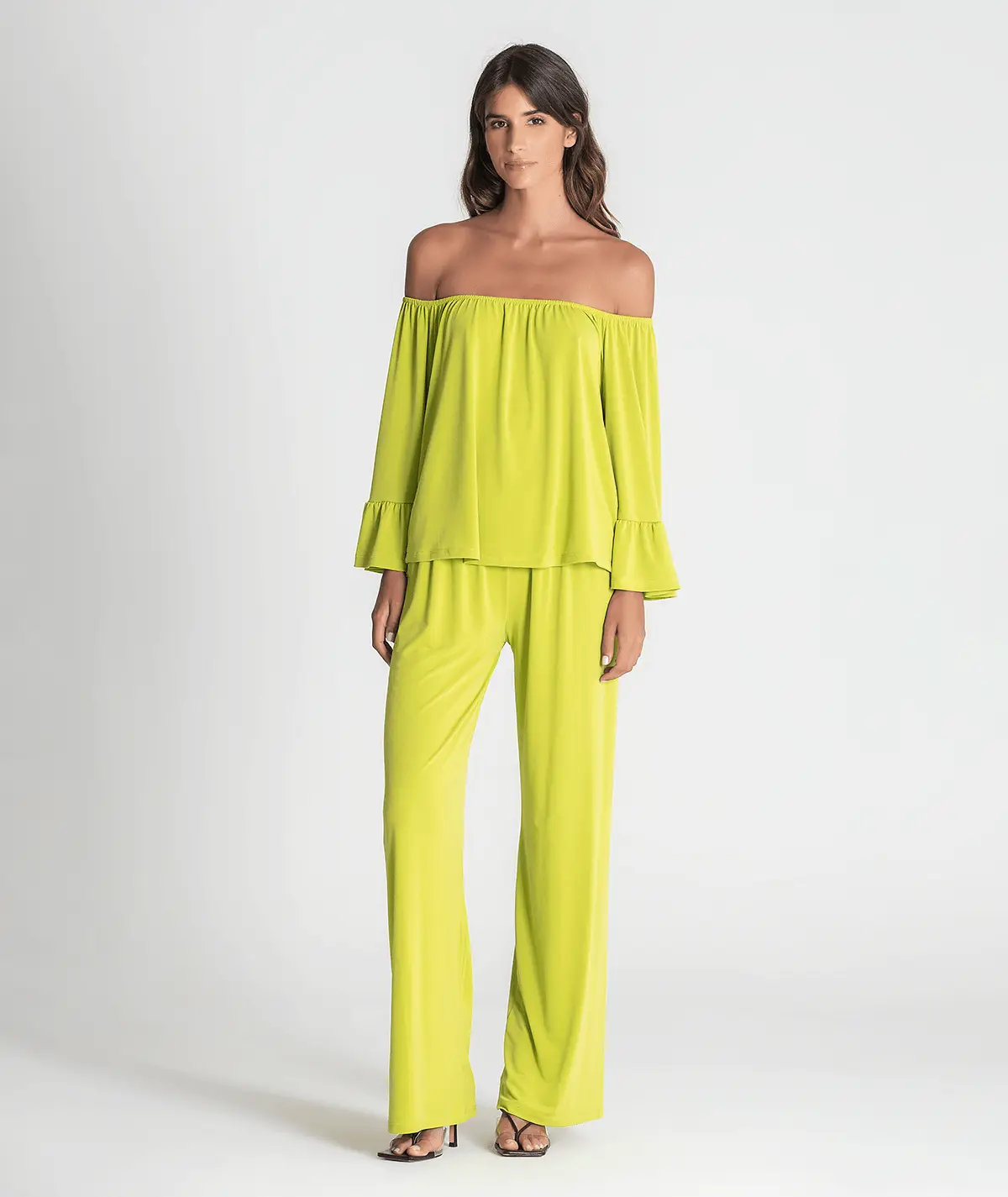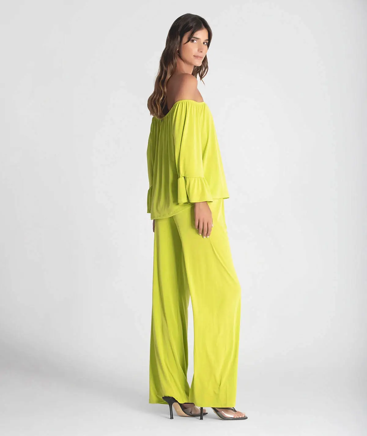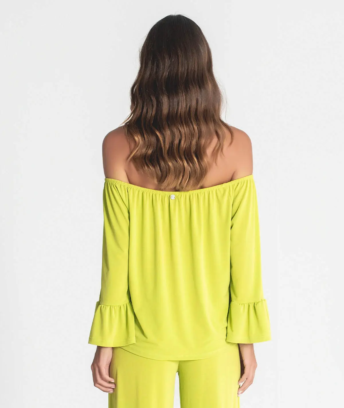 Blusa sem ombros com folho nas mangas.