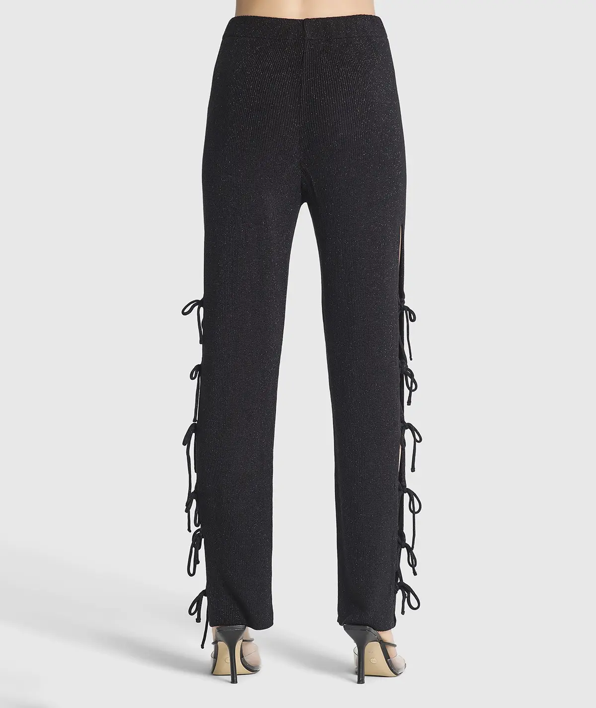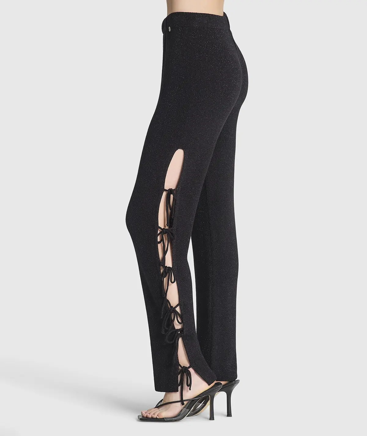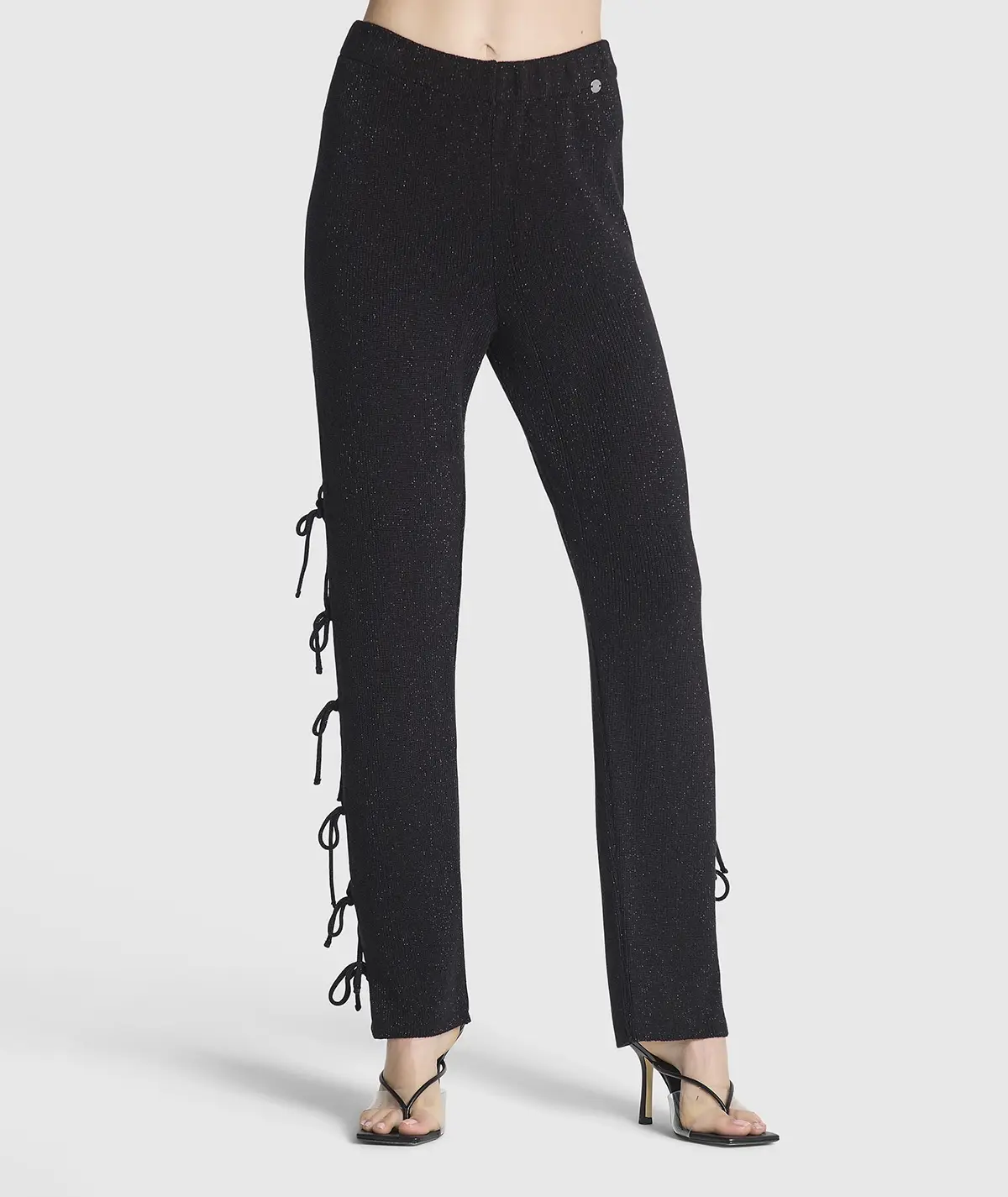 Calças com atilhos laterais e brilho. Ajusta na cintura com elástico.