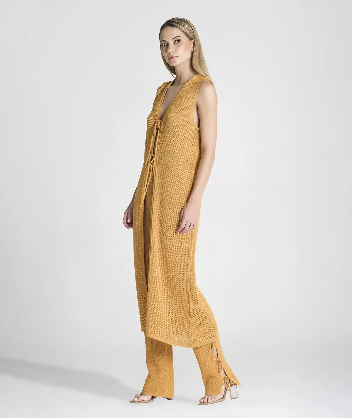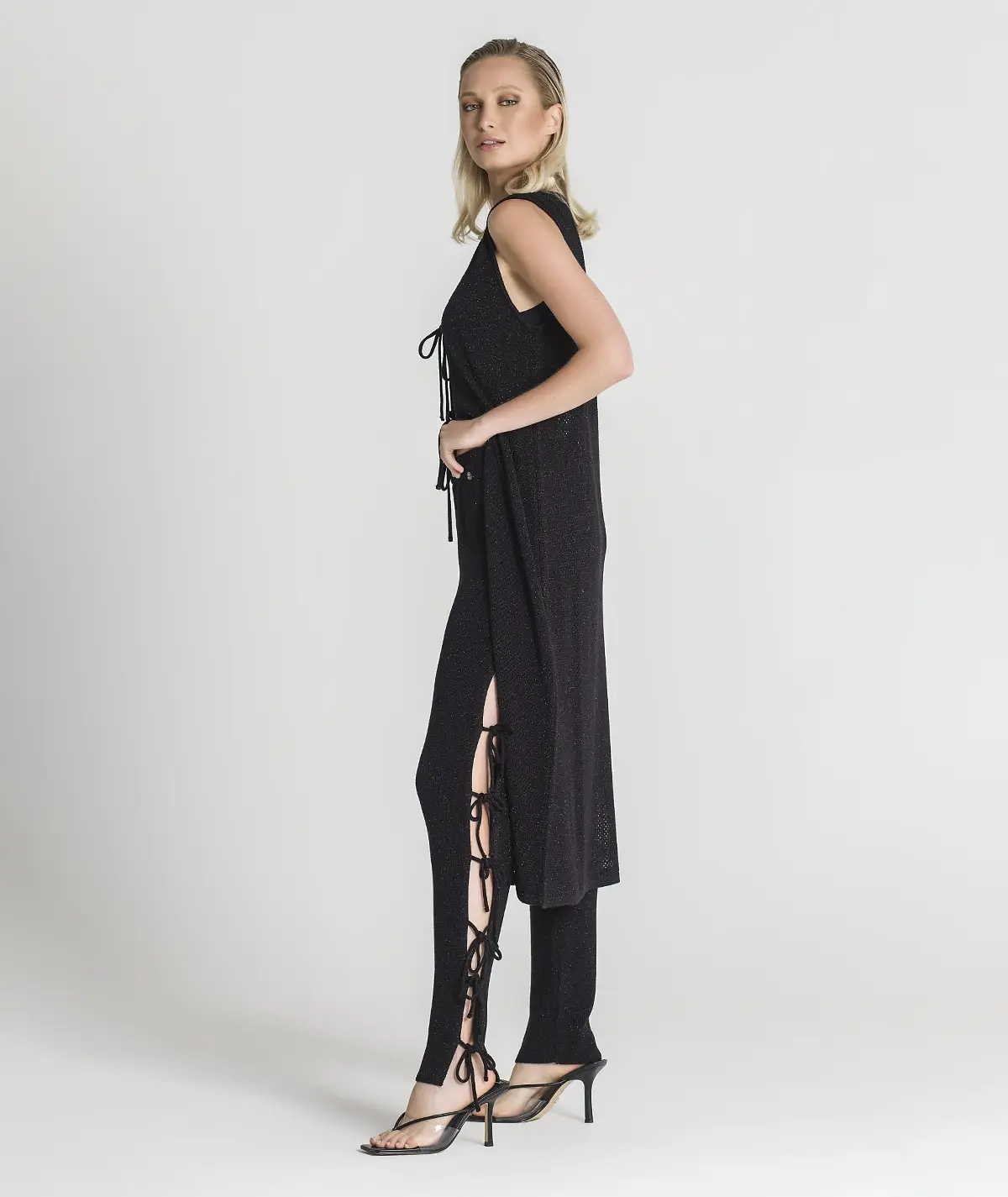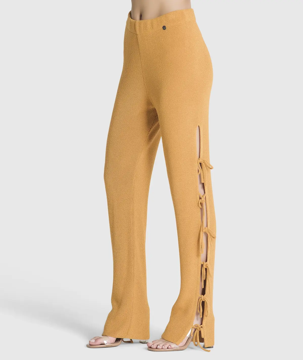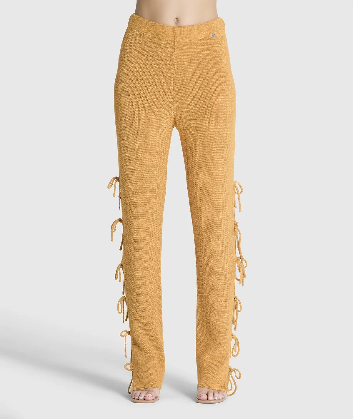 Calças com atilhos laterais e brilho. Ajusta na cintura com elástico.