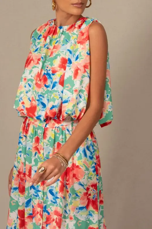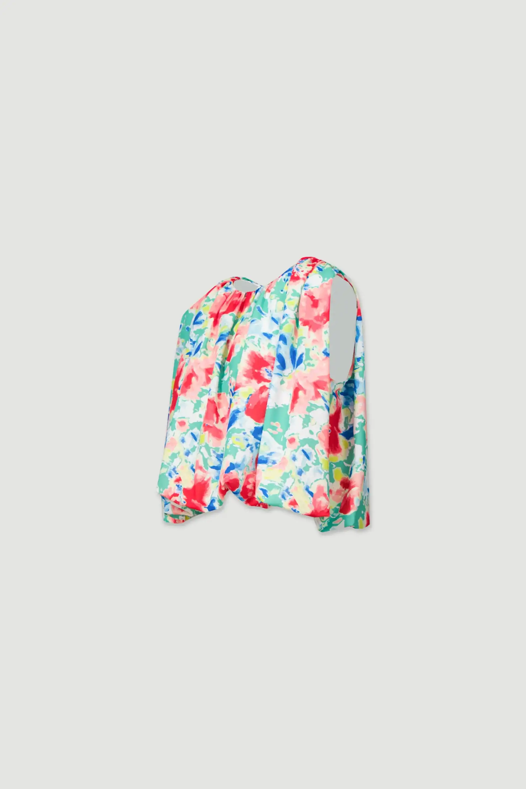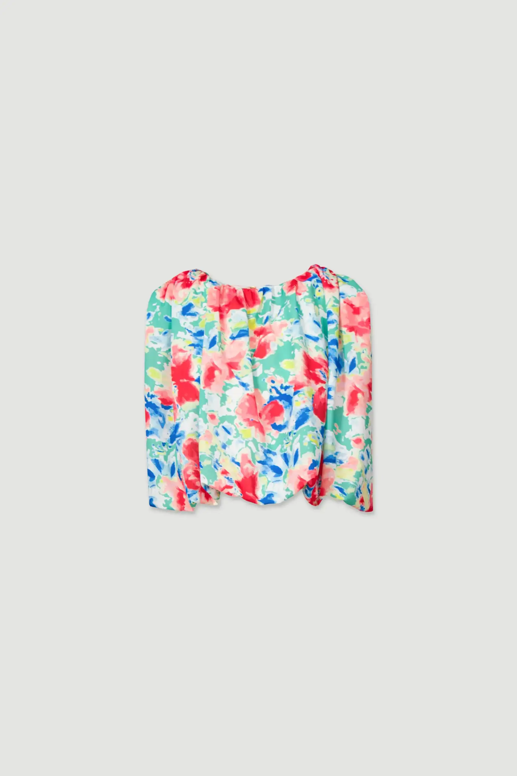 Top curto abalonado com padrão Ferrache. Possui alças largas com pregas, decote redondo, e detalhe de lágrima nas costas com fecho de botão. O elástico na parte inferior garante um ajuste perfeito.
