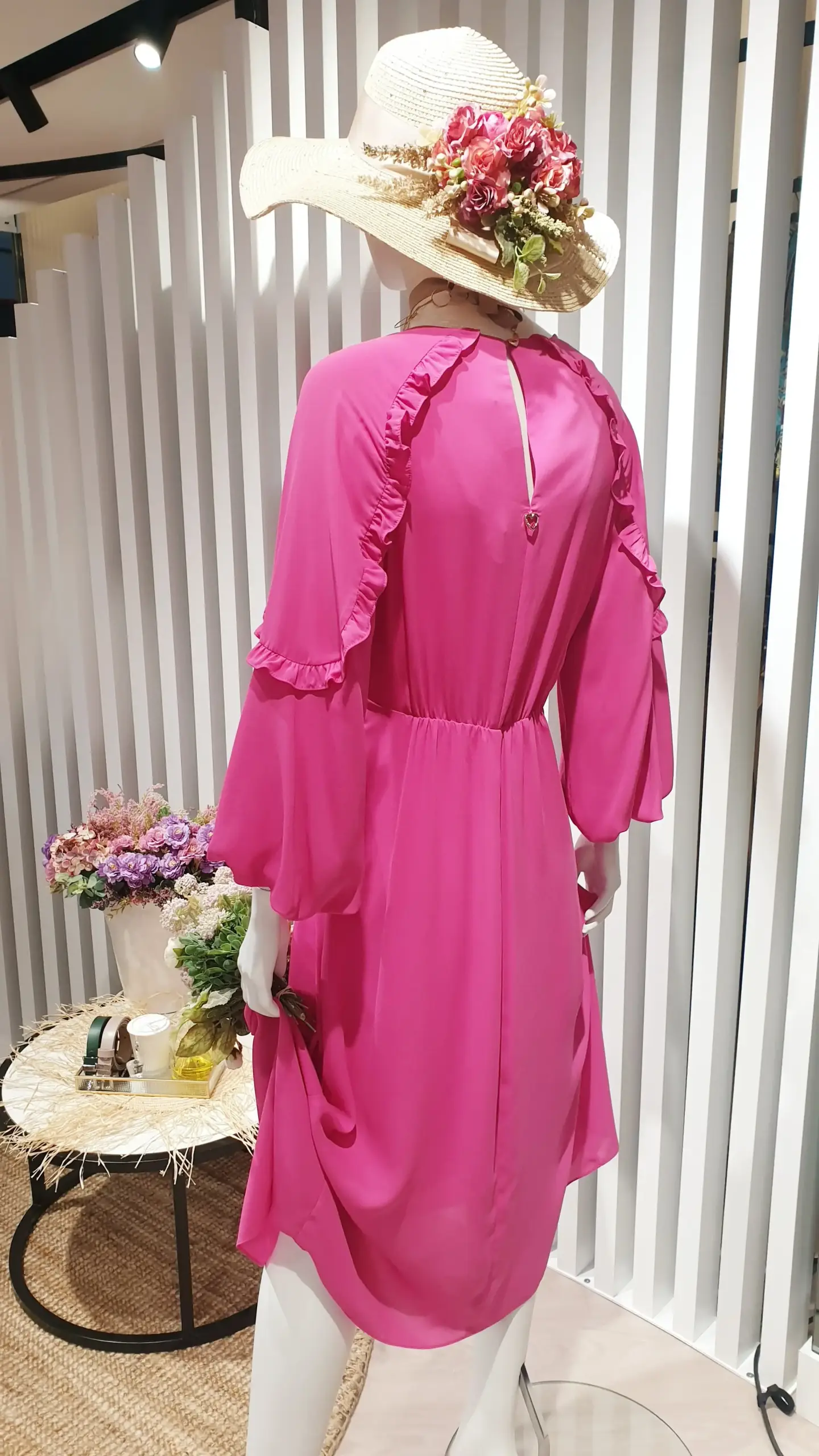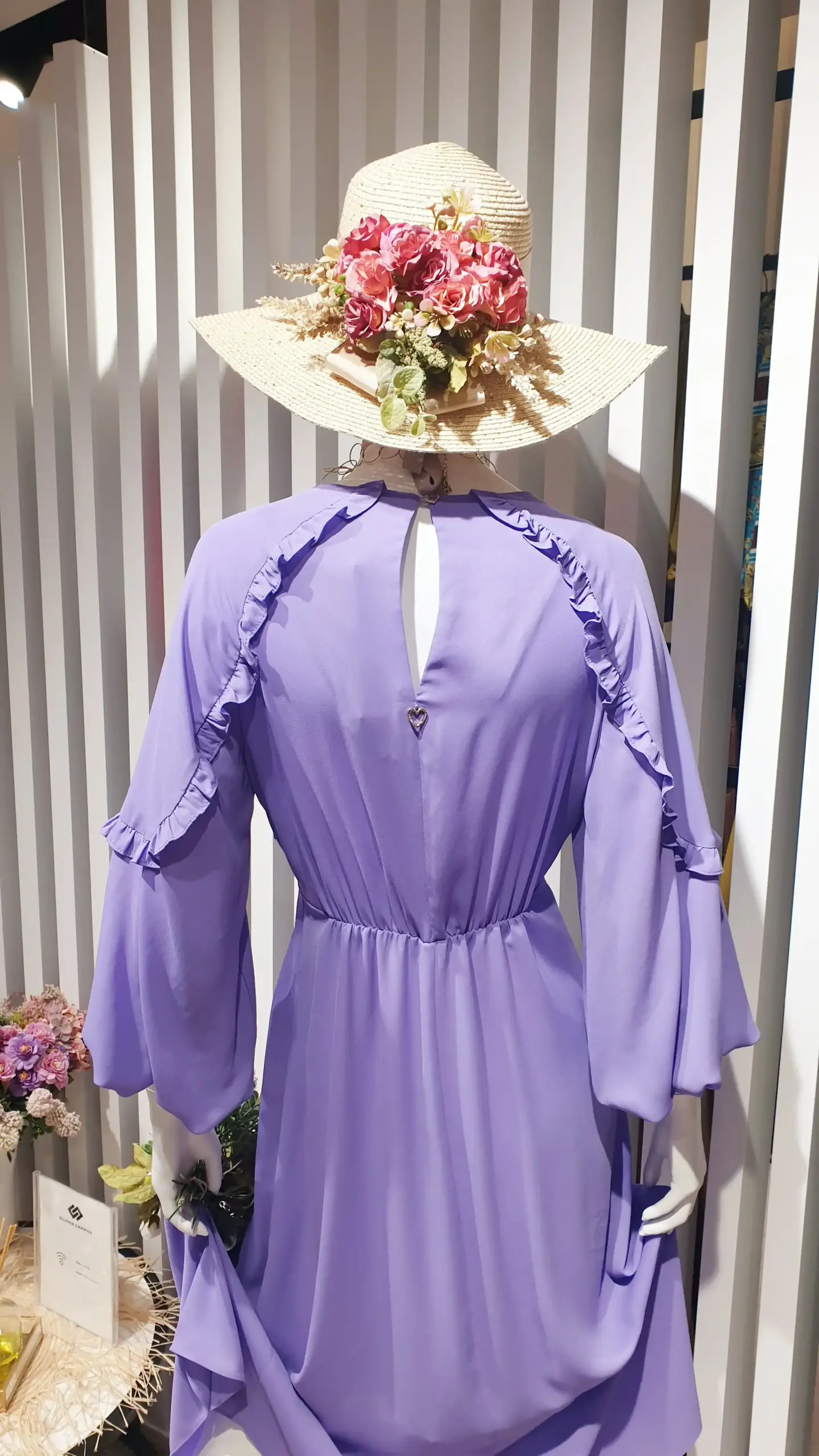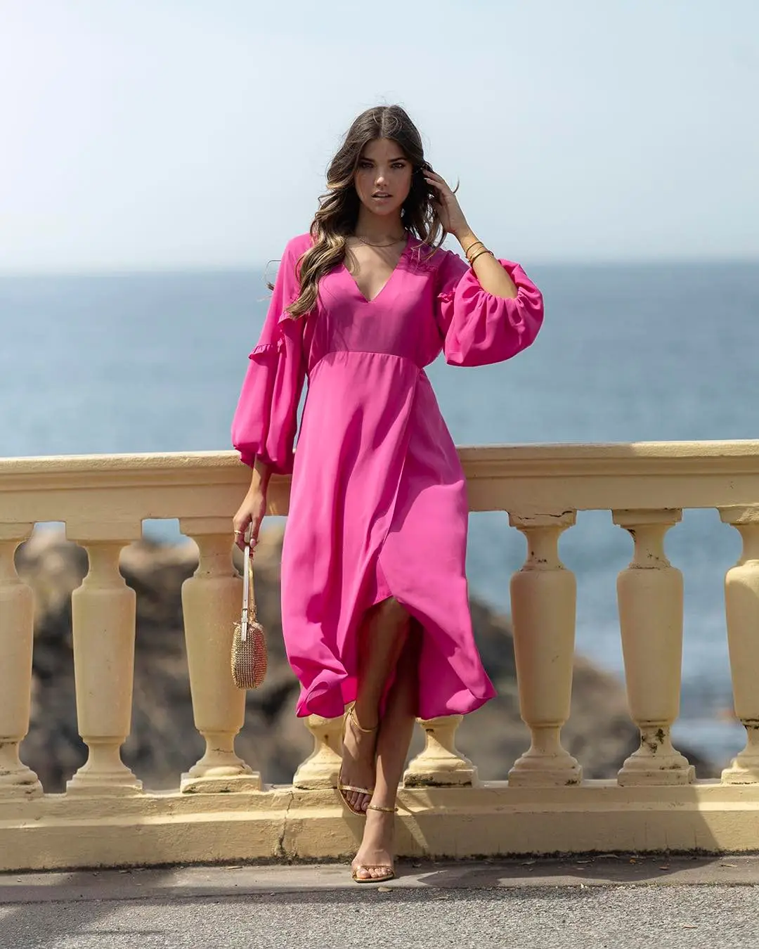 Vestido comprido com folhos de decote em V. Mangas 3/4 com elástico. Saia com efeito de trespasse e forrada. Fechamento nas costas com botão.