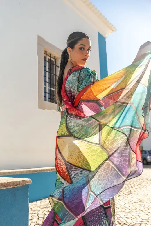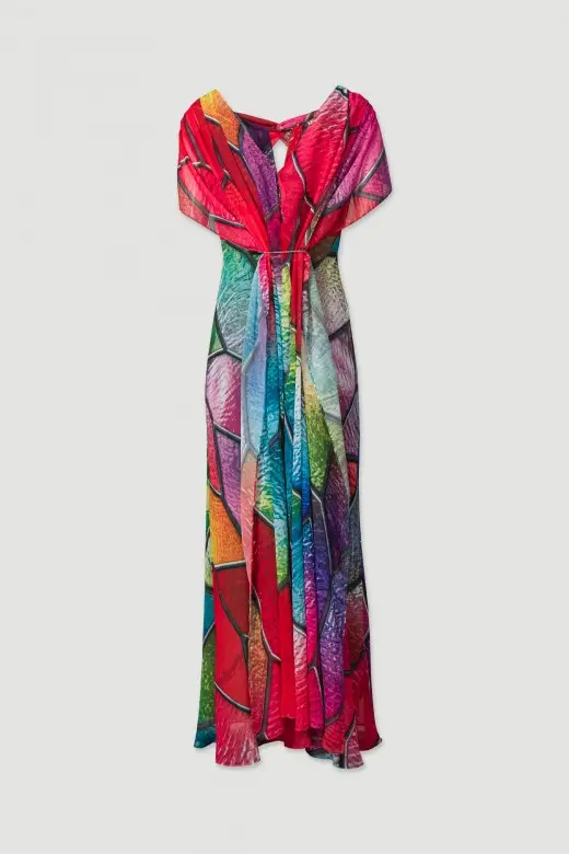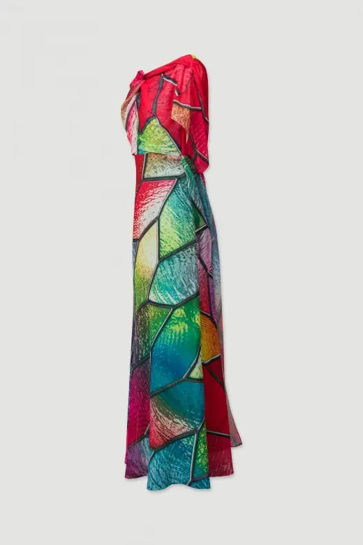 Vestido comprido com padrão Ferrache. Tecido duplo no ombro e costa, e detalhe de nó na frente. Fecho de correr na costa. Forro interior. Ideal para ocasiões formais e cerimónias, este vestido combina elegância e estilo atemporal.