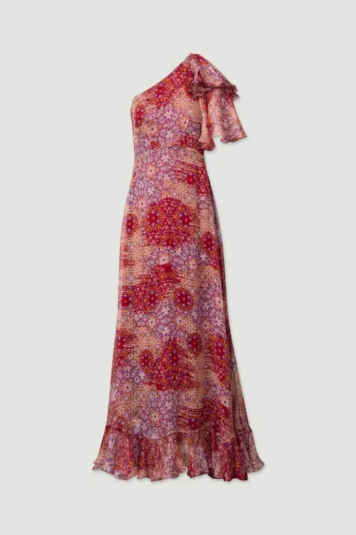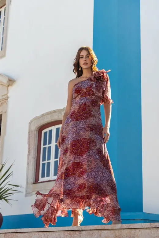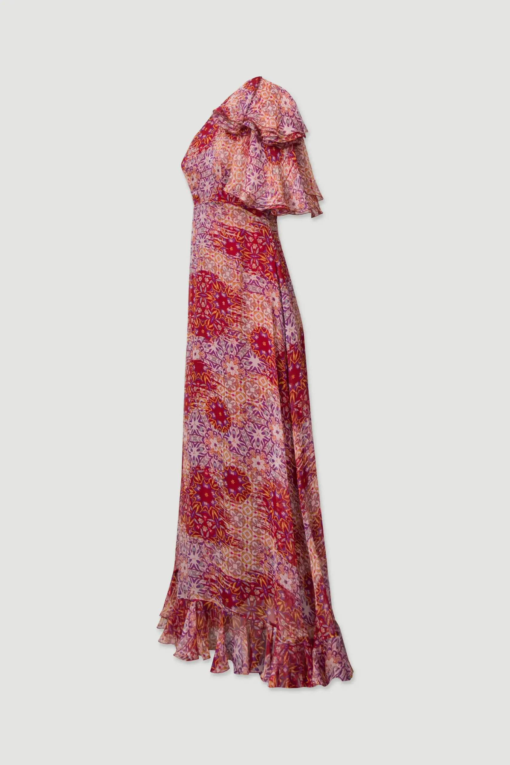 Vestido comprido estampado com decote assimétrico e manga curta. Possui folhos na manga e na parte inferior, além de fecho de correr na lateral. Forro interior. Ideal para ocasiões especiais e eventos formais.
